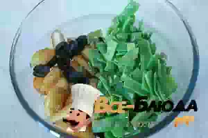 4. В салатнике смешать картофель, зеленую фасоль и маслины.