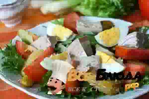 7. Для салатной заправки смешать измельченный чеснок с соком лимона. Перед подачей полить салат Нисуаз с печенью трески получившейся заправкой. Салат готов.