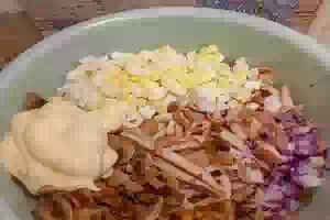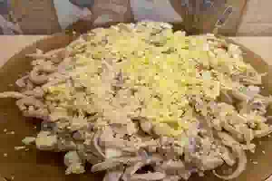 7. В большой миске соединить кальмаров, лук, яйца, шампиньоны. Добавить майонез и все перемешать. Если есть необходимость, салат можно подсолить и поперчить по вкусу. Салат из кальмаров с жареными грибами выложить на плоскую тарелку горкой и посыпать тертыми желтками. Убрать салат в холодильник на 30-40 минут, чтобы салат настоялся.