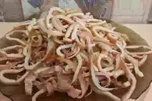 1. Кальмаров промыть, очистить, удалить хорду и отварить в кипящей воде (для этого достаточно трех минут). Сразу же залить тушки холодной водой. Так можно легко и быстро очистить тушки от остатков кожицы. Сварить яйца вкрутую (10 минут после закипания), переложить в холодную воду, и когда яйца остынут, очистить их.