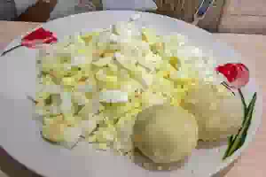 3. Яйца нарезать небольшими кубиками. Оставить целыми 1,5 желтка, которые понадобятся для оформления салата.