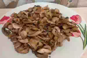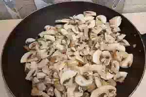 4. Шампиньоны промыть, порезать на кусочки и поджарить до готовности на растительном масле. При жарке подсолить грибы и добавить специи. Орегано и перец можно заменить на сушеный чеснок, базилик или прованские травы.