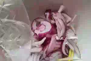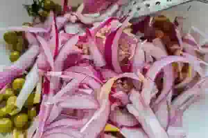 1. Сладкий салатный лук (крымский предпочтительнее) нарезать полукольцами и залить подкисленной уксусом водой. Оставить на 15-20 минут, чтобы убрать остроту. Затем откинуть на дуршлаг, чтобы стекла вода.