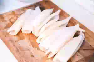 1. Тушки кальмаров ошпарить, счистить ножом кожицу, удалить хорду и срезать плавники.