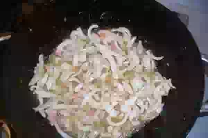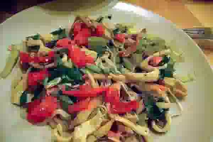 2. Основное кальмары жарить 1-2 минуты и выключать, тогда будут нежными. Собрала салат, часть составляющих (лук, печёный перец, киви, сок лимонный) отдельно на тарелочках. Далее начали играть с составляющими. Выводы: несомненно буду делать, так как данный рецепт располагает к фантазии. Неизменной должна быть часть приготовления до жарки кальмаров и приготовления лапши (включительно). Далее что угодно, на вкус и цвет. Киви мне не очень, сосед по столу его одобрил, перец понравился всем. Мне понравилось заправка с лимонным соком, сосед добавлял винный уксус и кинзу, кинза мне не покатила. Делали маленькими порциями, меняя заправки и составляющие. Каждый раз, подхватывая вилочкой очередную порцию салата, ощущаешь новый вкус, вот наверное это и есть главное в данном рецепте.