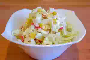 Перемешиваем все ингредиенты, даем салату настояться и можно подавать на стол. Салат из крабовых палочек с кукурузой и ананасами готов к подаче.