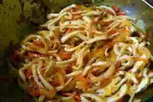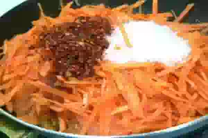 3. Морковь нарезаем тонкой соломкой. В отдельной сковороде обжариваем морковь, добавив сахар и паприку. Жарим морковь так же как и лук – 4-6 минут, непрерывно помешивая.