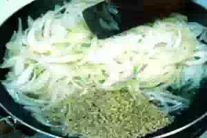 2. Лук нарезаем полукольцами, и обжариваем с 4 столовыми ложками растительного масла и одной столовой ложкой кунжутного семени. Жарить нужно минуты 4-6, постоянно помешивая, что бы лук не пригорел.