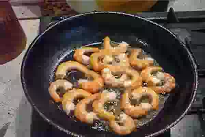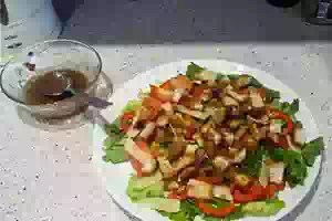 1. На большое блюдо нам понадобится около 300 г салата – лучше Романо, но можно и рукколу, и какой-нибудь салатный микс. Само блюдо нужно натереть долькой чеснока и выложить на него промытый и обсушенный салат. Далее приготовим гренки – в оливковое масло на 1 час положим раздавленную дольку чеснока, затем чеснок уберем и обжарим в масле кубики белого батона – около 200 г. Как зарумянятся – выкладываем их на противень, посыпаем любой смесью итальянских трав и подсушиваем в духовке минут 15. Остывшие гренки выкладываем на салатные листья, сверху по желанию выкладываем креветки, посыпаем крупно тертым пармезаном и заливаем заправкой.