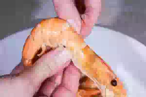 1. Вскипятить подсоленную воду, положить креветки и сварить до готовности. У креветок отделить хвостики от брюшка. Хвостики очистить от панциря, сделать продольный разрез вытянуть кончиком ножа внутренности (черная жилка).