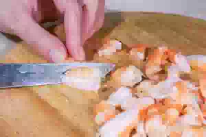 2. Каждый хвостик креветки нарезать на 3-4 части.