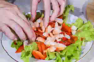 5. На большой тарелке разложить листья салата. Сверху, чередуя, выложить соломку сладкого перца и кусочки креветок. Затем уложите четвертинки яйца.