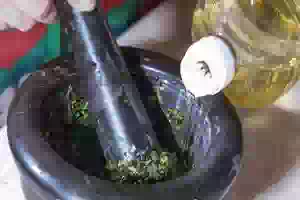 4. Для соуса мелко порубить петрушку. Зубчик чеснока разрезать на несколько частей и растереть в ступке в кашицу, добавив соль. Затем положите в ступку мелко нарезанную зелень петрушки и разотрите до получения однородной кашицы. Влить растительное масло и размешать. У вас должен получиться масляный соус яркого изумрудного цвета.