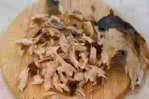 1. Филе копченной или запеченной рыбы разобрать на волокна. Конечно, можно нарезать кусочками, но руками быстрее.