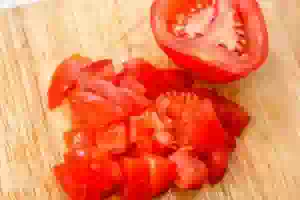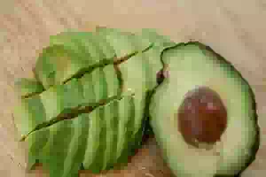 3. Авокадо надрезать по периметру, раскрыть, удалить косточку и ложкой вынуть мякоть. Нарезать её небольшими дольками или, как и помидоры, кубиками.