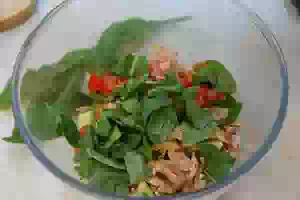 4. Листья рукколы вымыть, обсушить на бумажных полотенцах и порвать руками. Отправить в салатник овощи, рыбу и зелень.
