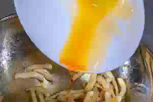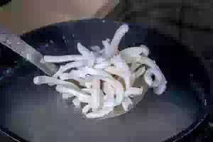2. Довести воду до кипения, бросить в нее полоски кальмаров, дать воде закипеть и после этого варить 3 минут. Откинуть кальмаров на дуршлаг и дать воде стечь.