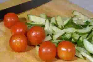 3. Огурцы нарезать соломкой, помидоры - четвертинкой. Укроп мелко порубить. Овощи сложить в салатник, посолить и убрать в сторону.