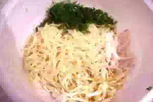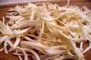 1. На вкус салат получился очень легким, свежим и интересным, но очень сытным. И выглядит неплохо. Кальмара чистим, отвариваем, нарезаем соломкой. Косичку сыра расплетаем и нарезаем полосками по 1,5-2 сантиметра длиной.