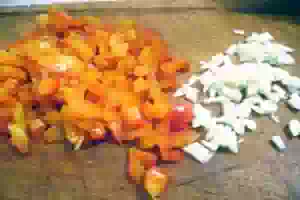 5. Теперь острым ножом удаляем кожицу, плодоножку и семена. Измельчаем чеснок и перец. Затем растираем ложкой перец и чеснок. Постепенно добавляя майонез. Получившимся соусом заправляем салат. Солить салат не нужно. Но перед подачей непременно дайте салату постоять минут 20-30 в холодильнике.