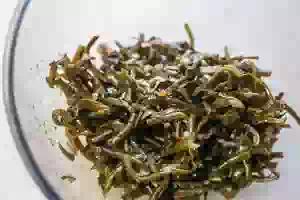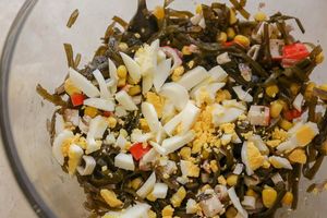 1. С банки консервированной морской капусты слить жидкость. Переложить капусту в большой салатник.