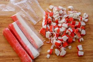 2. Крабовые палочки нарезать кубиками, переложить в салатник.