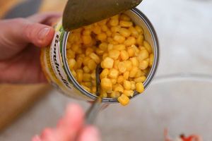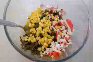 5. и отправить примерно половину банки сладкой консервированной кукурузы в салатник. Посолить и поперчить по вкусу и перемешать.