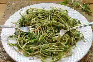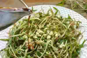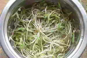 1. Как прорастить маш, чтобы получились хорошие проростки, описано в этом рецепте. Ростки промыть в холодной воде в просторной миске. В кастрюле довести до кипения воду, снять с плиты и выложить туда пророщенный маш.