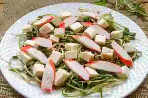 5. Сверху распределить нарезанные под углом крабовые палочки и кубики плавленого сыра.