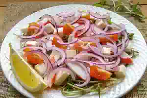 6. Разбросать четвертинки помидоров черри и некрупные полоски красного лука. Выдавить лимонный сок.