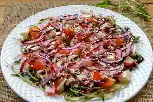 Салат из пророщенного маша с овощами и крабовыми палочками
