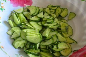 1. Огурцы нарежьте тоненькими ломтиками, сложите в глубокую миску.