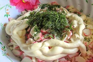4. Добавьте измельчённый укроп, посолите. Заправьте майонезом.
