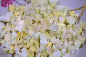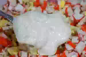 4. Перемешиваем яйца с крабовыми палочками и зернами граната. Заправляем салат по вкусу майонезом. Перекладываем готовый салат на блюдо и украшаем гранатом.