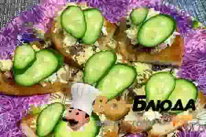 5. Молодой огурец нарезаем колечками немного наискосок и раскладываем по гренкам. На каждый бутерброд приблизительно понадобится два колечка свежего огурца. Подаем готовые гренки с тунцом как холодную закуску.