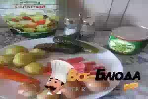 1. Продукты для салата из крабовых палочек перед вами. Заранее отварить картофель и морковь в мундирах. А яйца отварить вкрутую. Охладить.