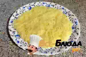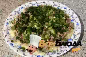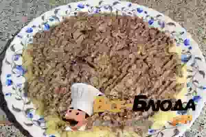 1. Картофель отварной натереть на тёрке. Выложить первым слоем на тарелку. Слегка присолить и поперчить.