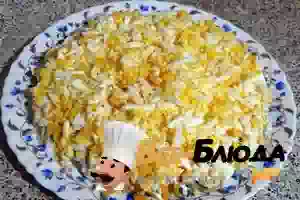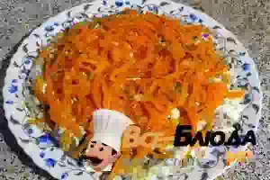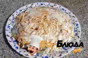 7. Сверху натереть яйцо куриное. И покрыть им весь салат. Поставить салат в холодильник на 30 минут.