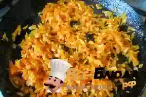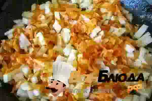 5. Добавить лук к моркови и поджарить все вместе. Снять сковороду с овощной поджаркой с плиты и дать остыть.
