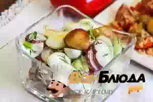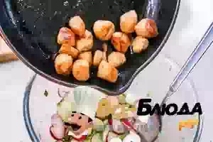 5. В салатник сложить овощи, посолить по вкусу и перемешать. Добавить к овощам гребешки и перепелиные яйца.