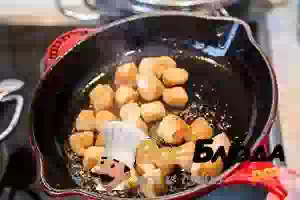 2. В ароматное чесночное масло выложить в один слой гребешки и жарить по 1-2 минуты с каждой стороны. Если гребешки совсем мелкие, то на их обжарку уйдет еще меньше времени. Обжаренные до готовности гребешки переложить на тарелку, прикрыть фольгой. Чтобы они оставались теплыми.