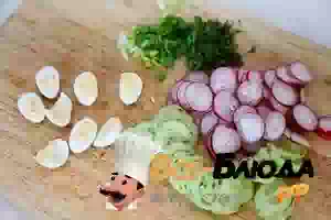 4. Со свежего огурца срезать овощечисткой кожицу и порезать тонкими кружочками. Редиску вымыть, обсушить на бумажном полотенце и тоже порезать кружочками. Свежую зелень мелко порубить.
