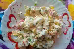 Салат «Рафаэлло» Ингредиенты: крабовые палочки - 200г сыр твердый - 100г майонез - по вкусу чеснок - 1 зубчик