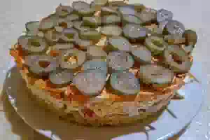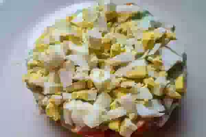 Слоеный салат из соленой семги с овощами и соусом из авокадо