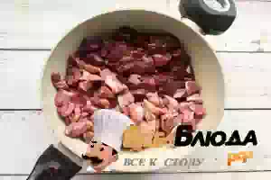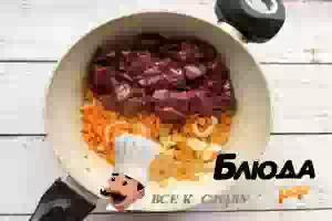 3. Свиную печень хорошо помойте, обсушите бумажным полотенцем, нарежьте небольшими кусочками и выложите к овощам.