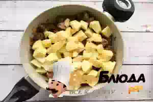 6. Картофель очистите от кожуры, помойте, нарежьте средними кусочками и добавьте его к остальным ингредиентам.