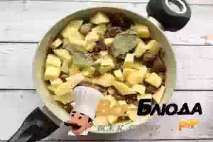 7. В сковороду налейте немного воды или бульона, добавьте соль, перец, специи и тушите на маленьком огне 30-40 минут.