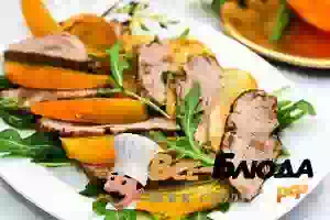 6. На салатную тарелку выложить листья зеленого салата и сбрызнуть из частью соуса. Утиную грудку нарезать ломтиками и уложить, чередуя с хурмой, поверх зелени. Сверху полить оставшимся соусом и подавать к столу. Теплый салат из утиной грудки с хурмой готов.