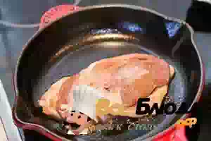 4. Поставить сковороду на средний огонь и положить промаринованную утиную грудку кожей вниз на холодную сковороду. Жарить до румяной кожицы, затем перевернуть и продолжать жарить с другой стороны около 2-3 минут. Обжаренную утиную грудку обернуть фольгой и довести до готовности в прогретой до 200С духовке.