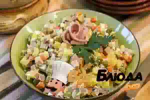 6. Салат посолить, поперчить по вкусу. Добавить мелко нарезанную зелень. Заправить оливье майонезом, аккуратно перемешать и убрать в холодильник, чтобы салат настоялся перед подачей. Салат оливье с окороком готов.